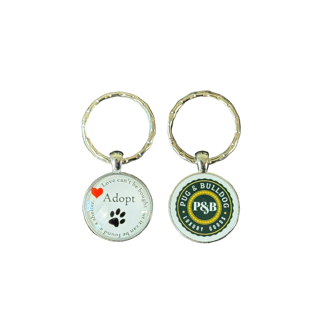 Show your support of shelter's and adopting pets! This is a 1" round stainless keychain with domed acrylic "Adopt, Love can't be bought but it can be found at a shelter" on one side and P & B on the other. Both sides shown.
