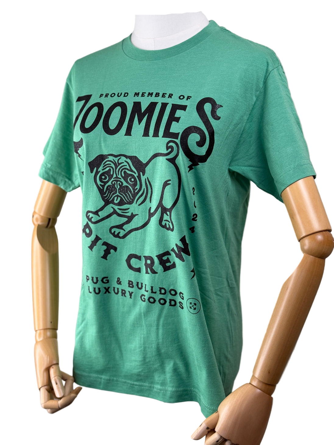 The anytime anywhere essential Zoomies Pit Crew T-shirt is here! This classic fit medium weight Kelly Green shirt in 60% Cotton and 40% Polyester. Black graphics on the front only. Machine washable for easy care.