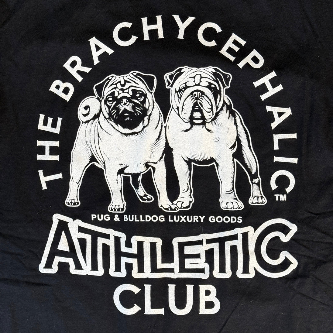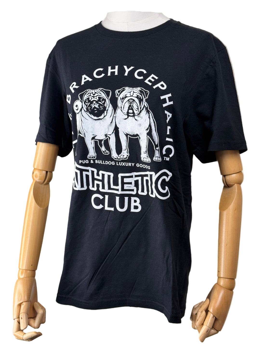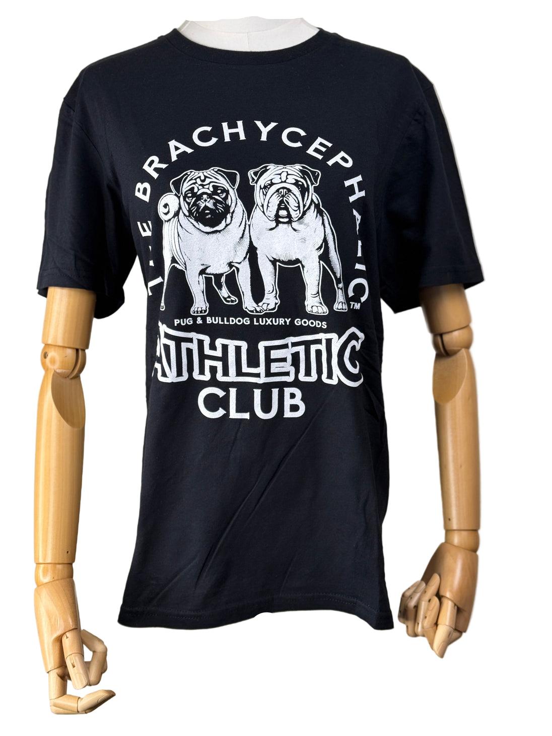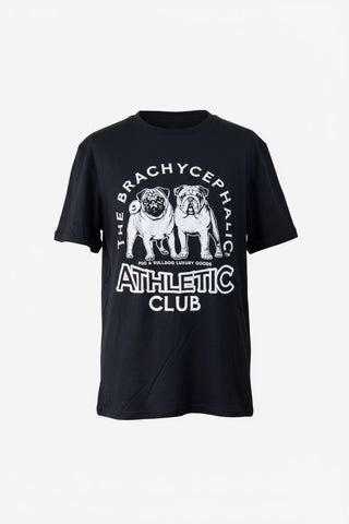 This is our exclusive Brachycephalic Athletic Club T-shirt. You will adore this classic fit medium weight Black shirt in 100% Cotton. White graphics on the front only. Machine washable for easy care.