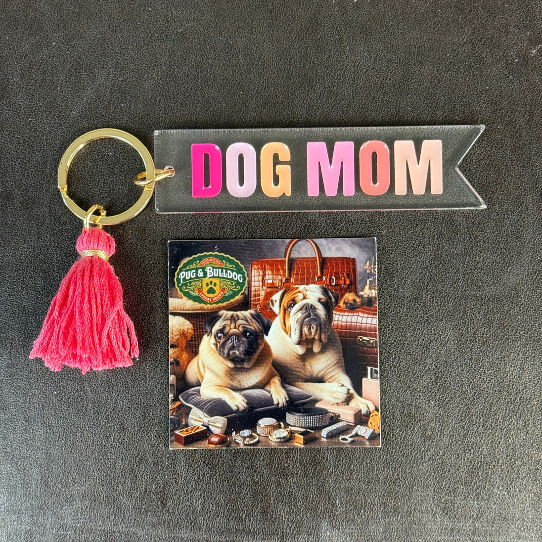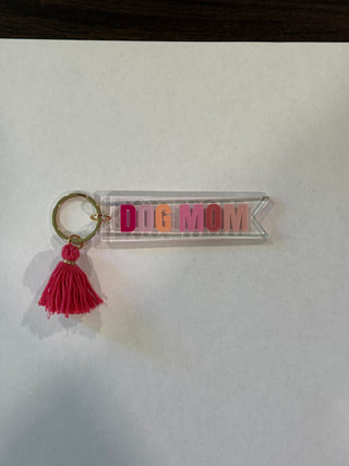 A must have for all the Dog Moms out there! This is a clear Acrylic keychain with engraved and filled lettering with a gold split ring and tassel. The acrylic is 1" wide by 4" long.