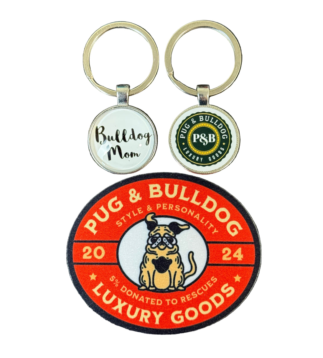 Calling all Bulldog Dog Moms! This is a 1" round stainless keychain with domed acrylic Bulldog Mom on one side and P & B on the other. Both sides shown. You are sure to love it!