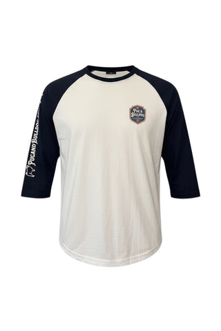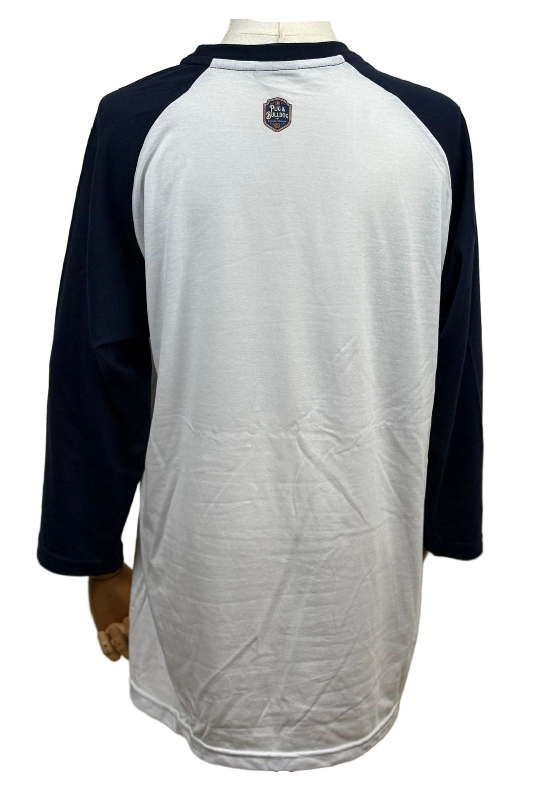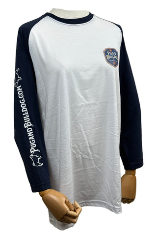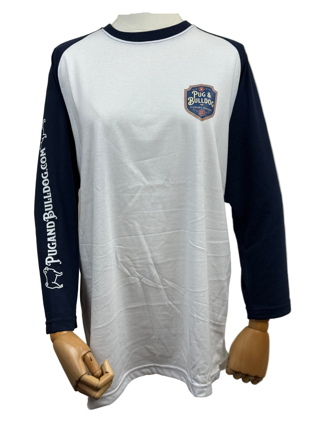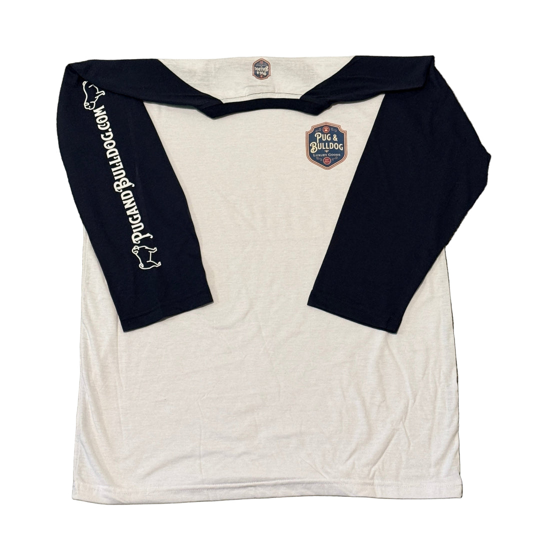 This is our Pug & Bulldog Baseball long sleeve T-shirt. This classic is always in style! Classic fit in medium-heavy weight 80% Cotton & 20% Polyester. White body with Navy Blue raglan three quarter length sleeves. Full color graphic on the front left breast, Pug & Bulldog on the right sleeve and our mini full color logo on the back just below the neck line. Machine wash and tumble dry low for easy care.
