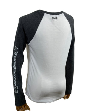 This is our exclusive Women's Raglan Long Sleeve Thermal Knit Shirt in White & Heather Grey. Slim fit that's perfect for layering. 58% Cotton, 39% Polyester and 3% Spandex. Black front graphics with a Small P & B just below the neck line on the back with White graphics on the left sleeve. Machine wash and tumble dry lowfor easy care.