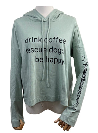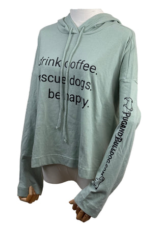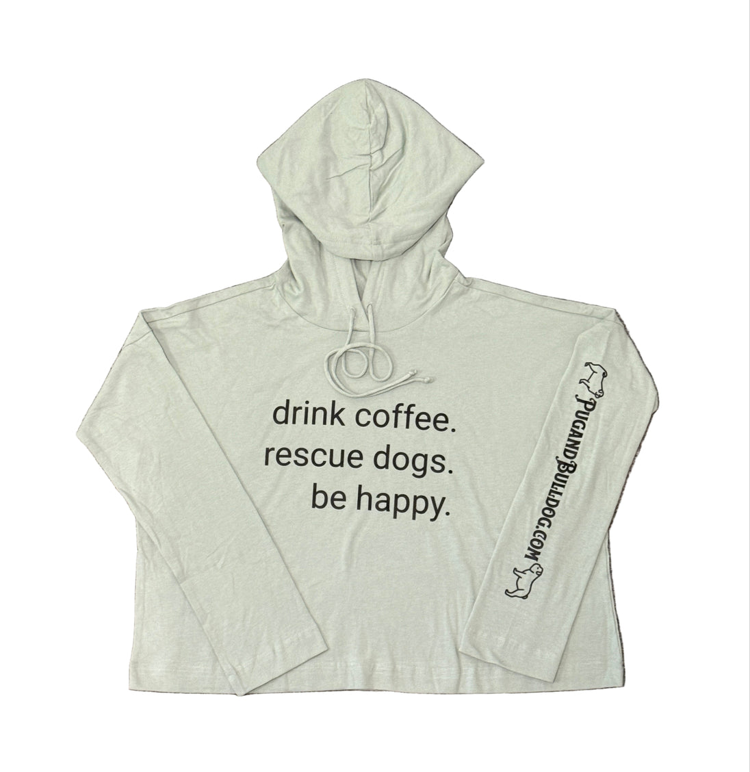 This is our exclusive Women's "Be Happy" Long Sleeve Hooded T-Shirt in Dusty Mint. Classic boxy fit with a cropped body length. Medium weight 100% Cotton. Black graphics on the front and left sleeve. Machine wash and tumble dry low for easy care.