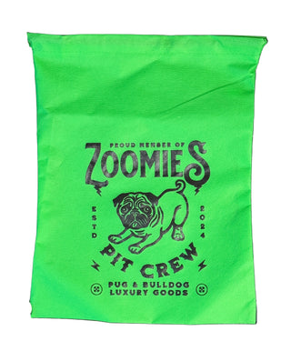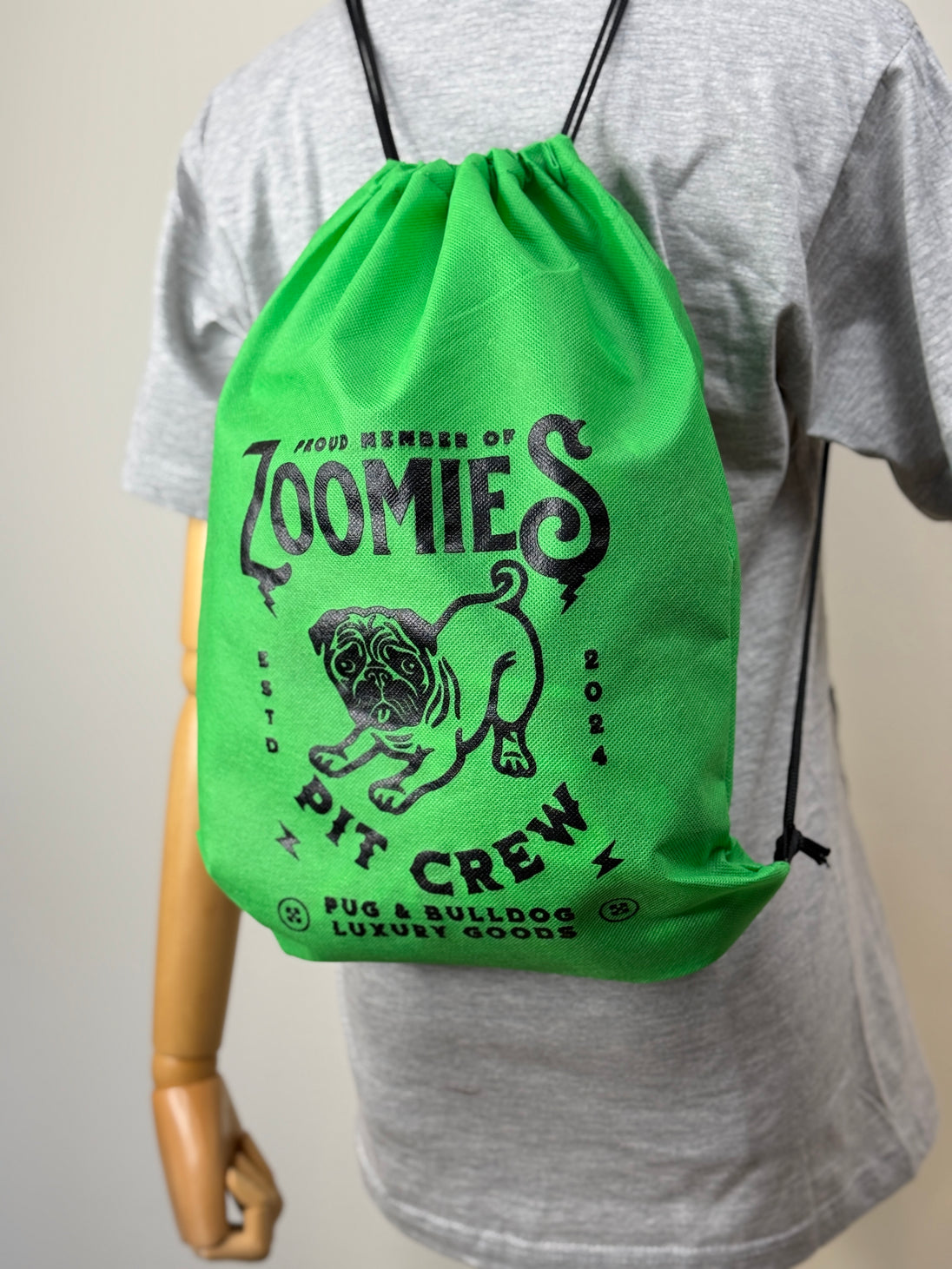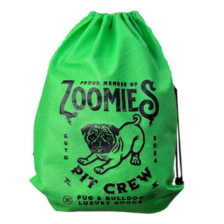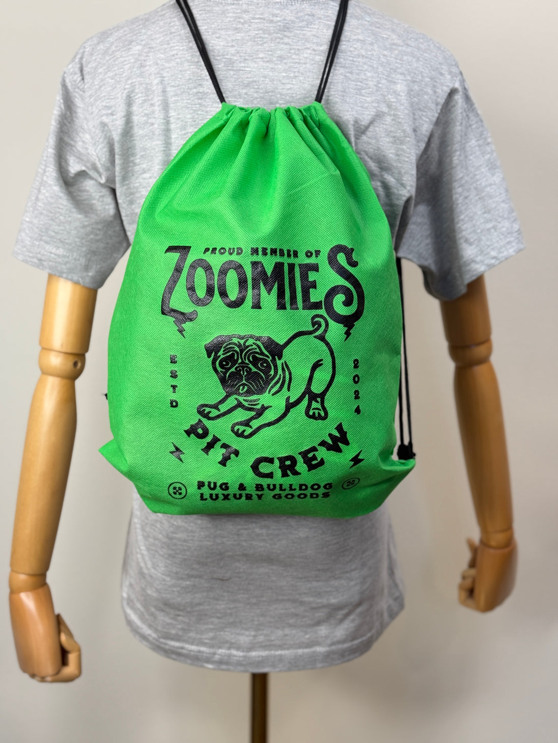 Our classic Zoomies light weight drawstring backpack. Perfect for heading to the dog park or a ballgame. Large size so it will is easily hold all your needs for the day.