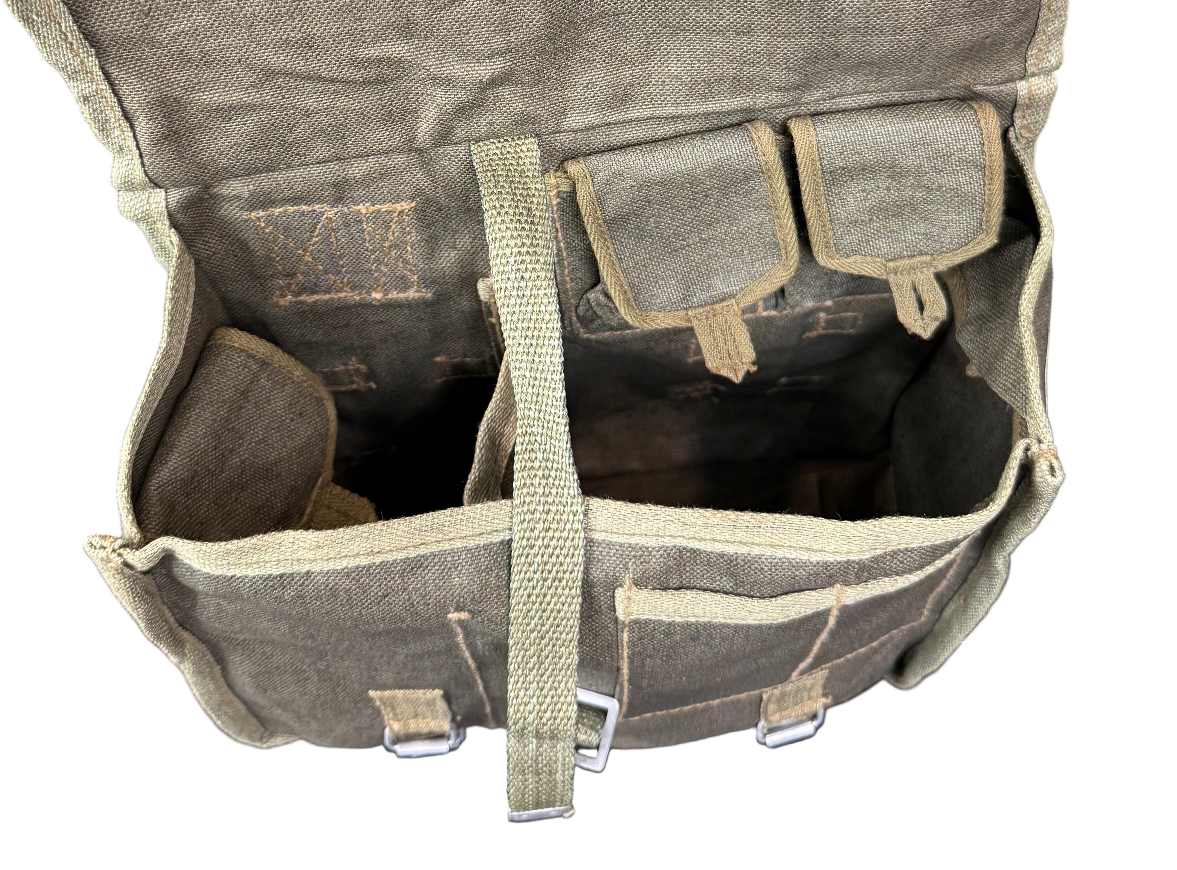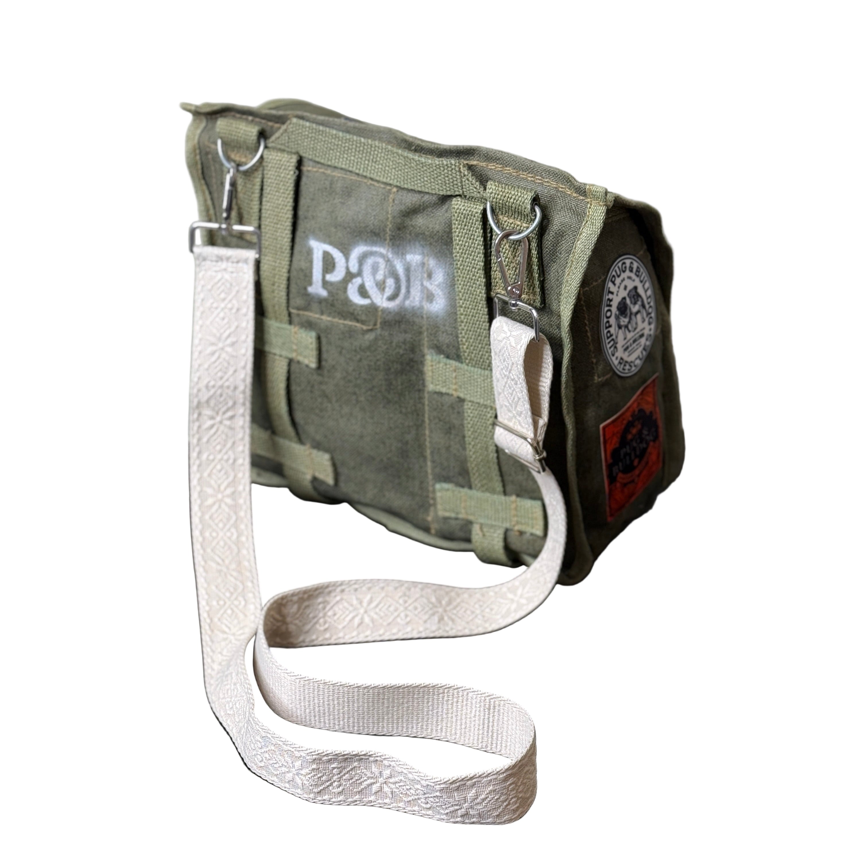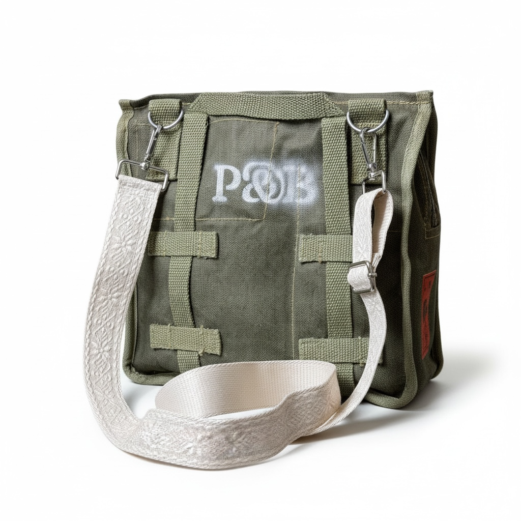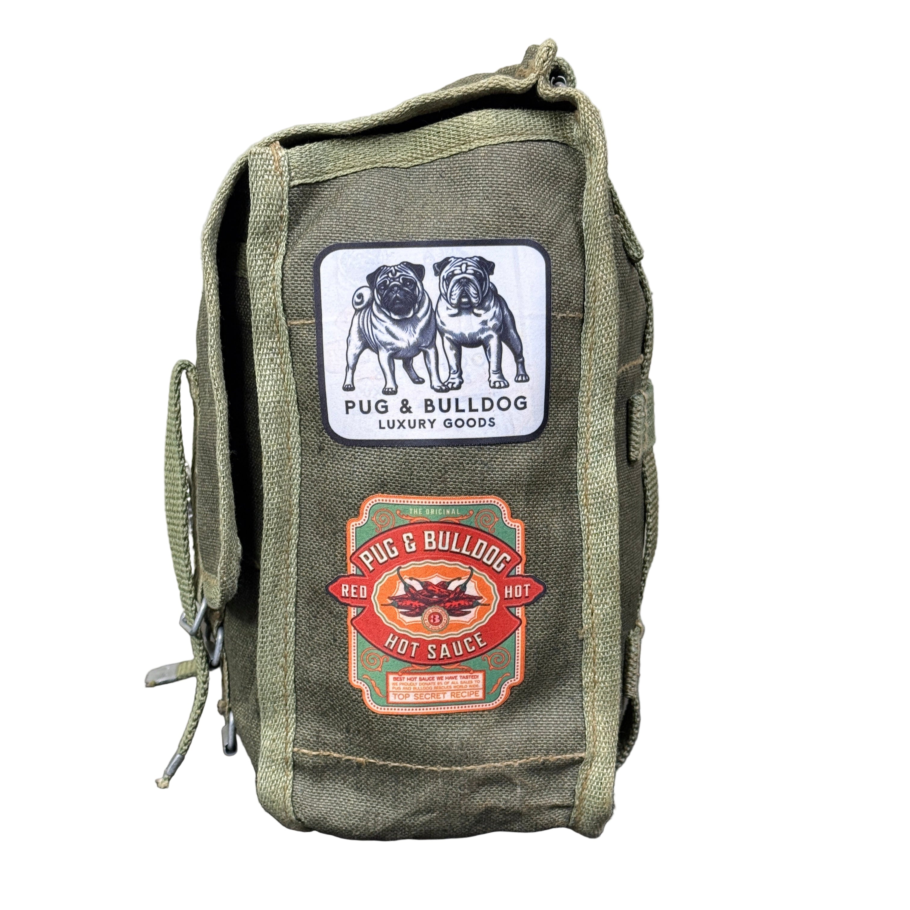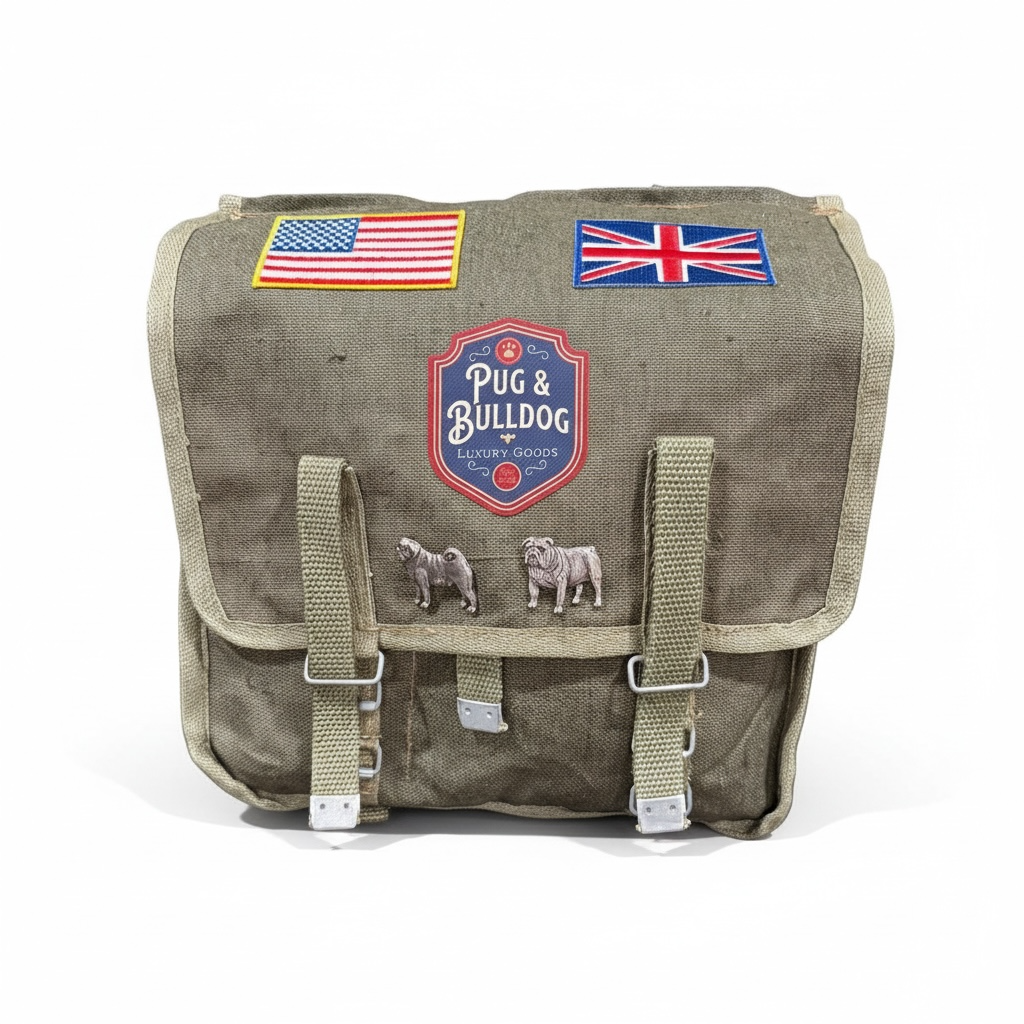 This is our Vintage Military Surplus Messenger Bag. These 1990's era medium weight canvas military surplus bags are now ready to start a new life. We carefully added the Pug & Bulldog touch to these including an embroidered strap. Medium in size and capacity with two internal sections and multiple small pouches. Has a grab handle on the back at the top. The dimensions are 11" high by 11" wide by 6" deep. Care: Spot clean by hand and hang dry.