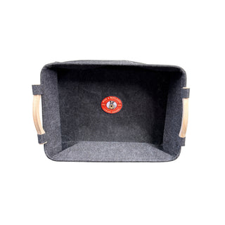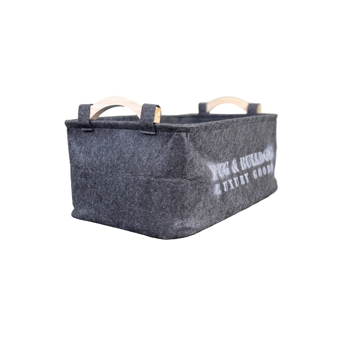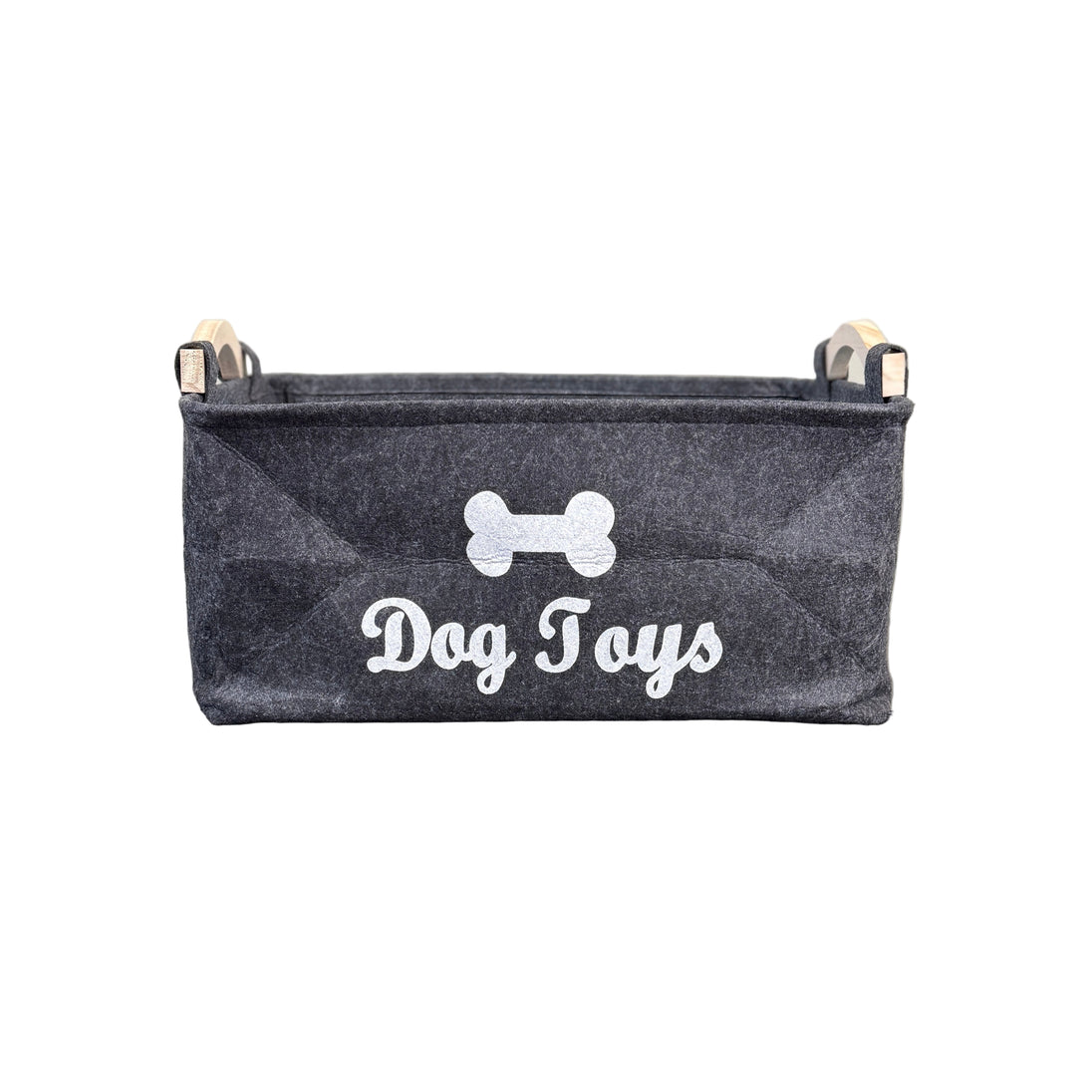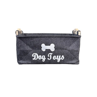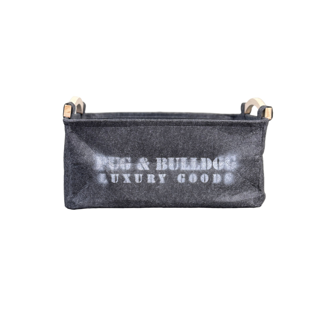 This is our classic P & B Toy Bin made from heavy Felt with wood handles. It's the perfect size for all your furry family's toys and shenanigans. It's the perfect height for easy access by your Pug or Bulldog. Dimensions are 7 1/2" high by 15" long by 10" wide. Water Resistant coating. Hand wash.