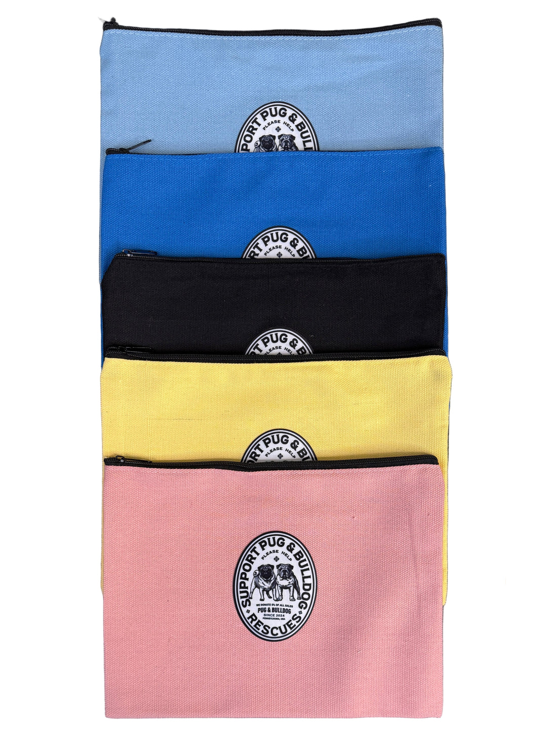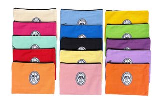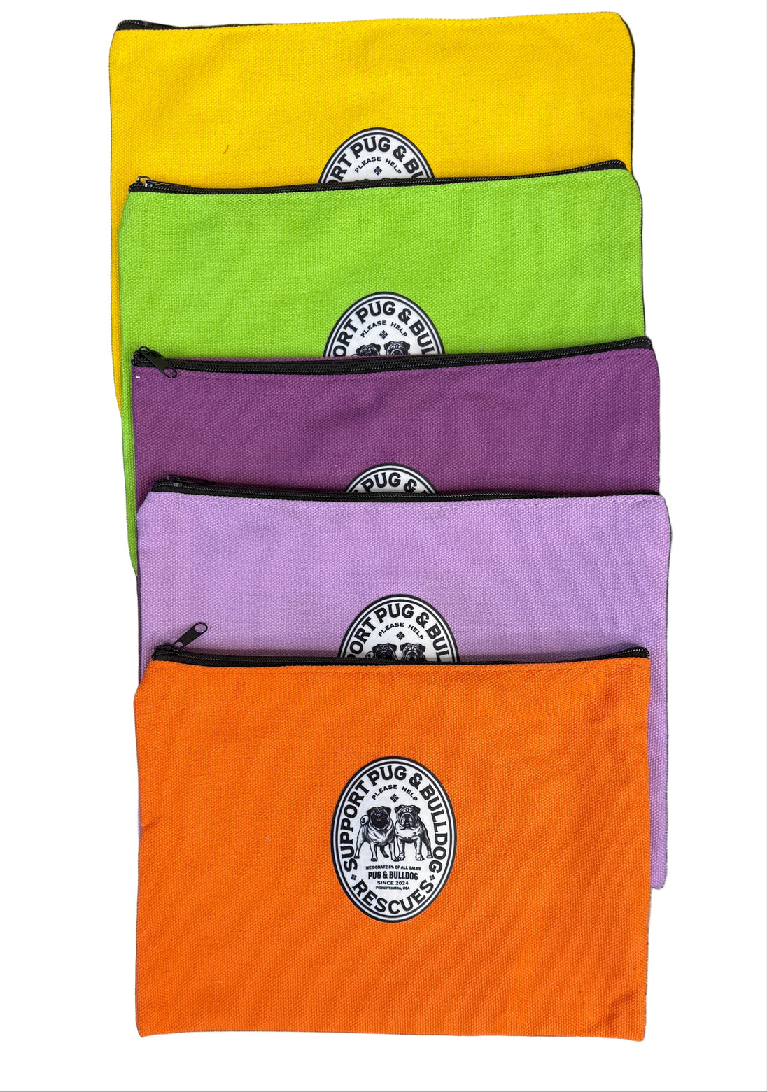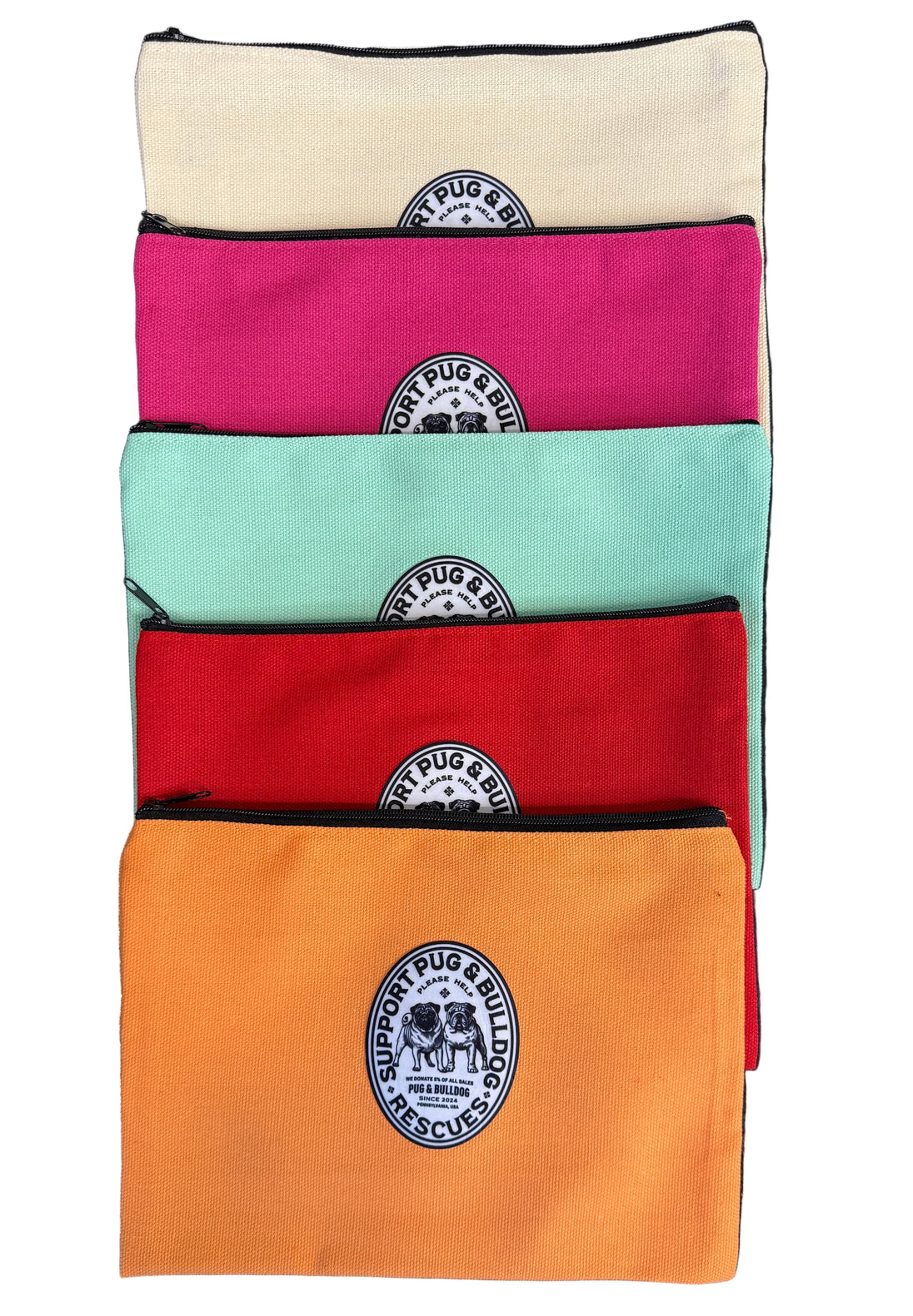 Wow you are going to love these colorful canvas zip pouches for everything you can think of. These are so handy for inside your handbag, backpack, briefcase, travel bag or glove compartment. Each one comes with our classic patch on one side. The dimensions are 9" wide by 7" high.