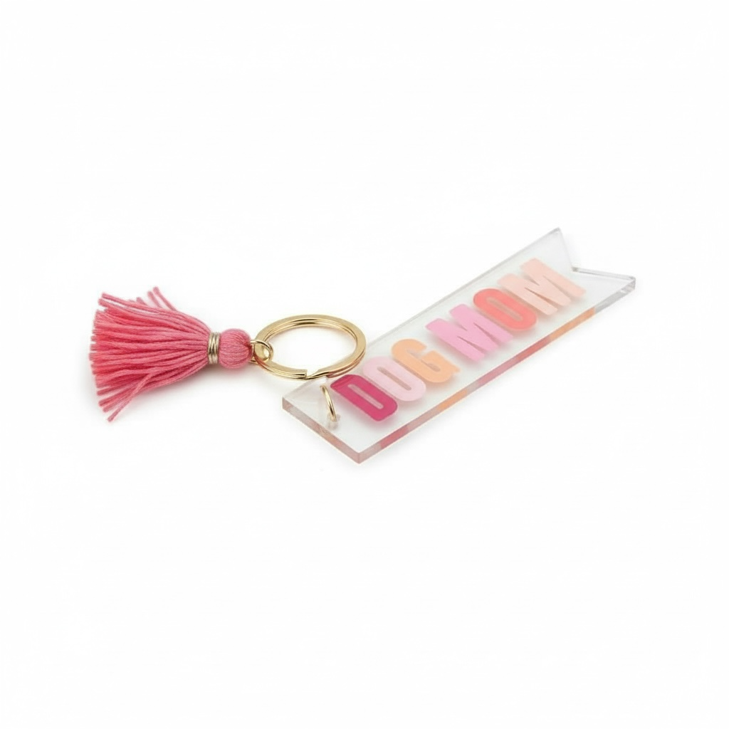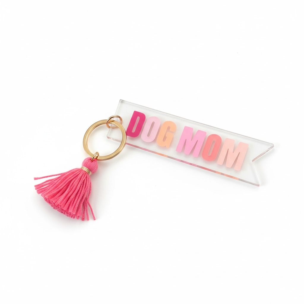 A must have for all the Dog Moms out there! This is a clear Acrylic keychain with engraved and filled lettering with a gold split ring and tassel. The acrylic is 1" wide by 4" long.