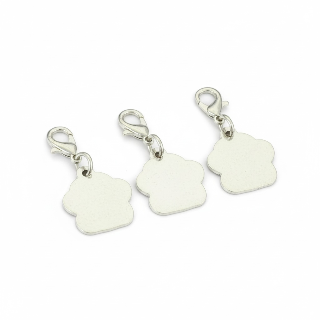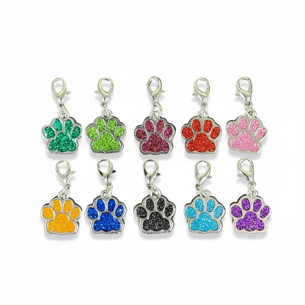 These are mini stainless steel sparkly paw print charms. Each one has a lobster clasp to attach them to your keychain, bracelet or whatever you like. The sparkly inset color is only on one side. Each Paw is 5/8" not including the clasp. Choose your favorite color!