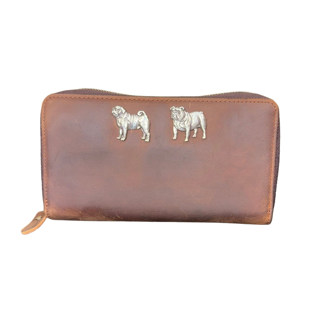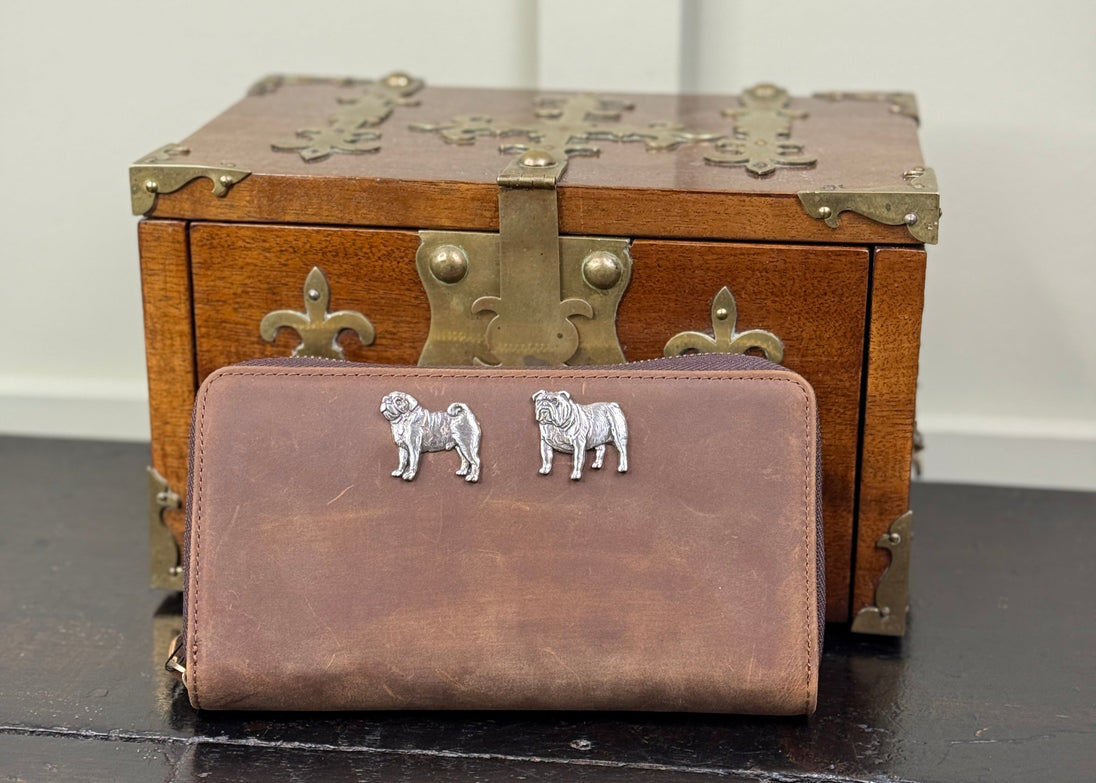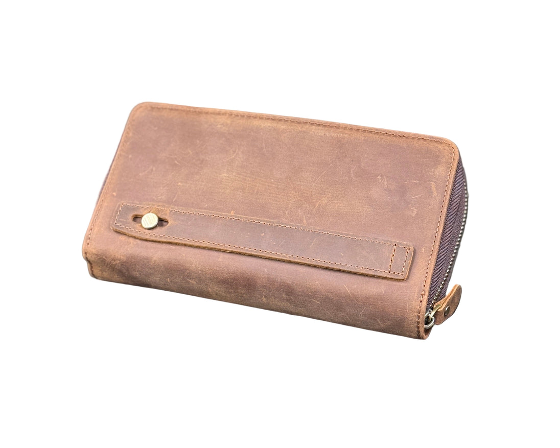 You will love our Penny Leather Wallet. It has so many sections and dividers and is ready to grab and head out on its own or throw it in a shoulder bag or Backpack. Large wallet size to easily phone, money, credit cards, and other necessities for your day. Plenty of Interior pockets for all your items. Zippered closure at the top to keep anything from sliding out. The back has a single hand strap for carrying or release it on one end and loop it on to your backpack strap. Heavy duty construction of Crazy Horse Leather with brass zippers & hardware. Named after our extremely intelligent rescue Corgie. Dimensions: 8 1/2" wide by 5" high by 1 1/2" deep.