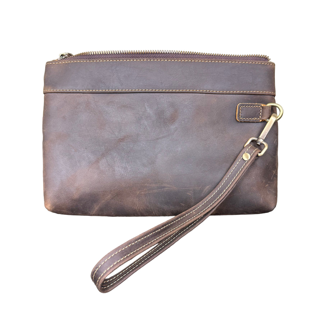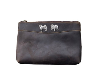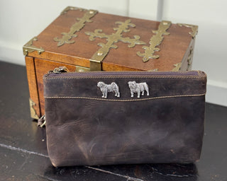 This is the ideal daily Leather wristlet that is ready to head to the office or your next meeting. Medium size to handle your Phone, Wallet, keys and other necessities for your day. Plenty of Interior pockets in the main compartment including one zippered. Zippered closure at the top to keep anything from sliding out. Includes a detachable wrist strap on the back. Heavy duty construction of Crazy Horse Leather with brass zippers & hardware. Named after our very cute but odd Black Pug. Dimensions: 10 1/2" wide by 7" high by 1" deep.