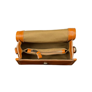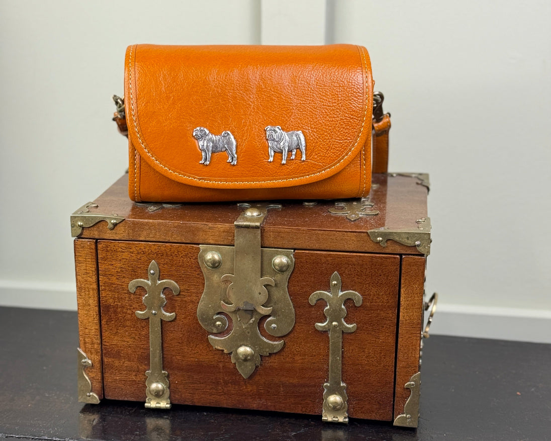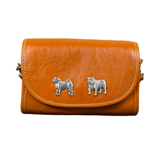 This is our charming Samantha Leather Handbag. The perfect anytime bag! Gorgeous top quality Pumpkin colored Leather with heavy duty hardware and our classic Pug & Bulldog concho's. One center interior zippered pocket that divides the main section into two sections. One exterior zippered pocket on the back. Comes with the perfect length shoulder strap. Named after our sweetest cuddly fawn rescue Pug. The dimensions are 7 3/4" wide by 5 1/2" high (Not including straps) by 4" deep.