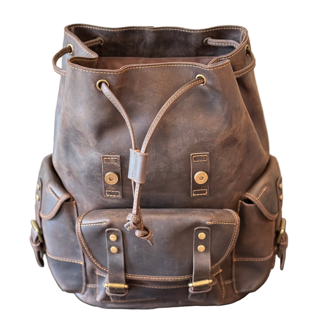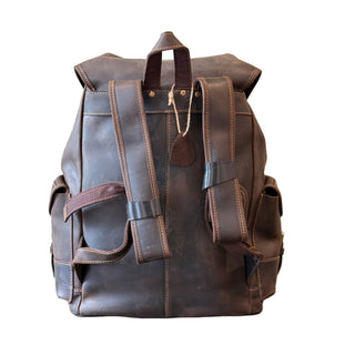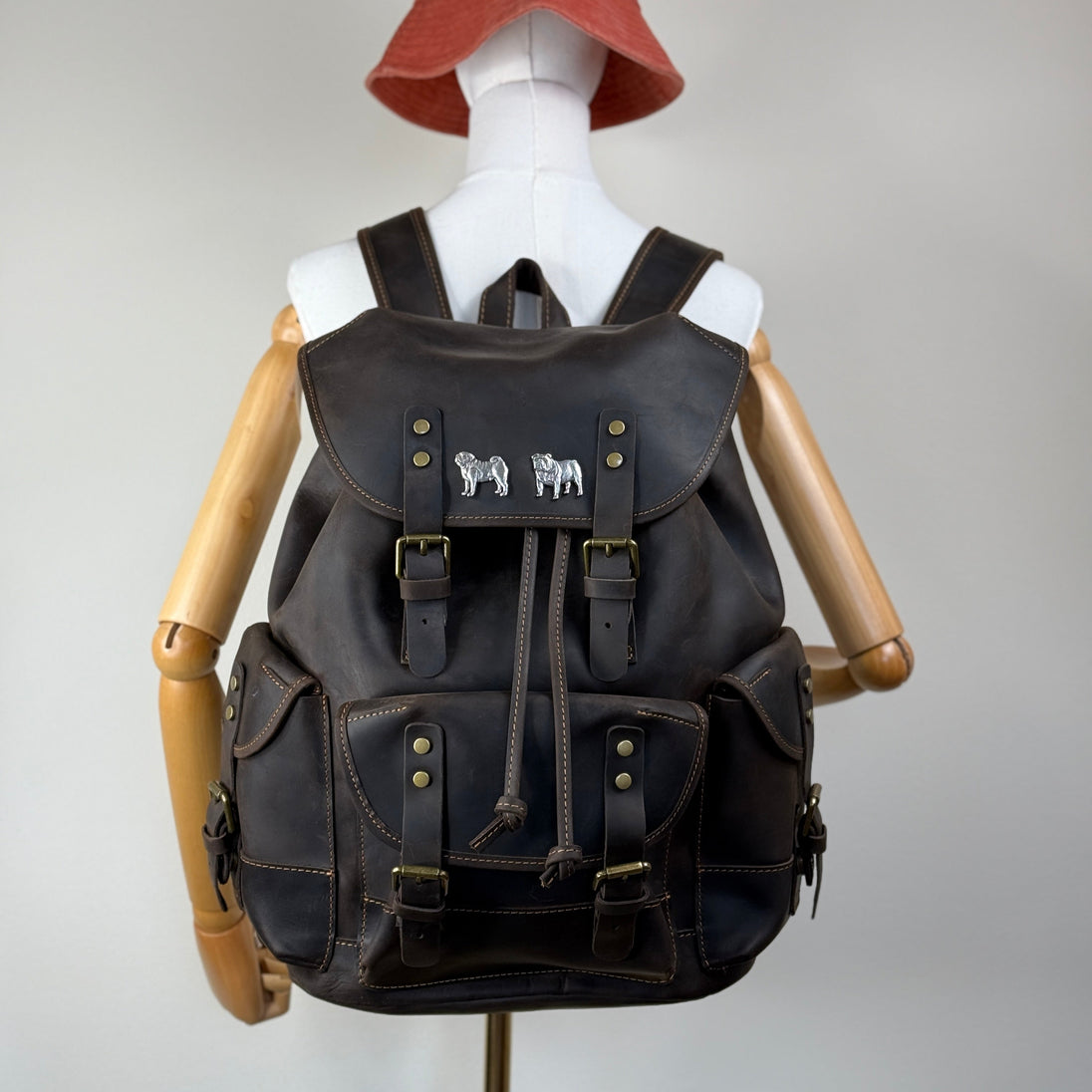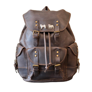 This Gorgeous Large Leather Backpack is the answer for day touring in your favorite city or a weekend in Nantucket. Large size to accommodate everything you would need for your day out, while leaving plenty room for souvenirs. Exterior has three generous sized quick access pockets. Interior has a padded iPad or Laptop pocket that will accommodate up to 10" by 12" dimensions. Multiple other pockets including one zippered for all your small items. Heavy duty construction of Crazy Horse Leather with brass hardware and rivets. Padded Leather shoulder straps and a Leather grab handle at the top. Named after our founders beloved English Bulldog. Dimensions: 17" wide by 18" high by 8" deep, not including straps.