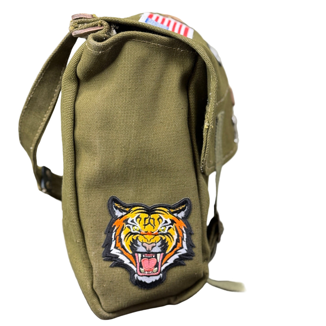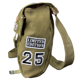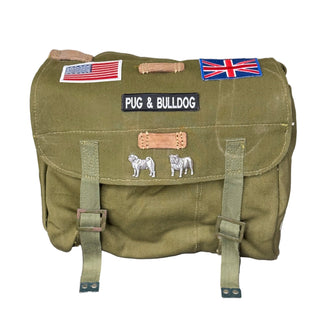 This is our 2nd Year 2025 Limited Edition Vintage Military Surplus Shoulder Bag. Limited to only Seven pieces. These 1970's era super heavyweight canvas and leather military surplus shoulder bags have lasted over 50 years and are now ready to start a new life. Whether shopping in New Hope PA & Lambertville NJ or sightseeing in Annapolis MD you will love this bag. We carefully added the Pug & Bulldog touch to these. Medium in size and capacity with two internal sections. We have included all the extra original leather straps with buckles inside bag for your use to attach other items to the bag. The dimensions are 12" high by 15" wide by 5" deep.