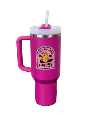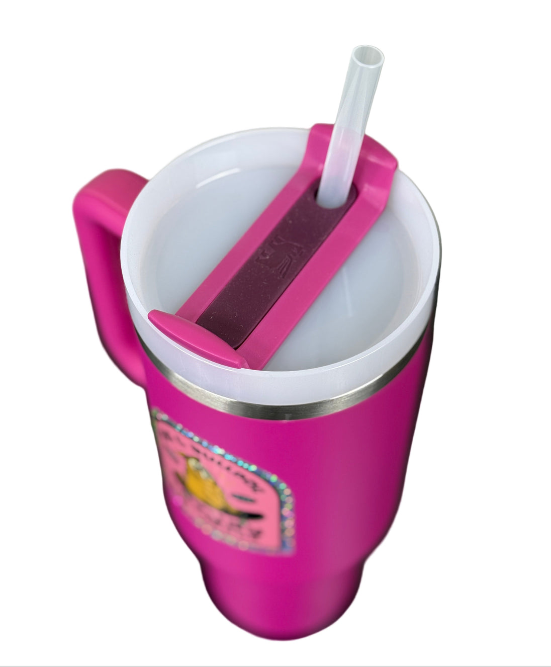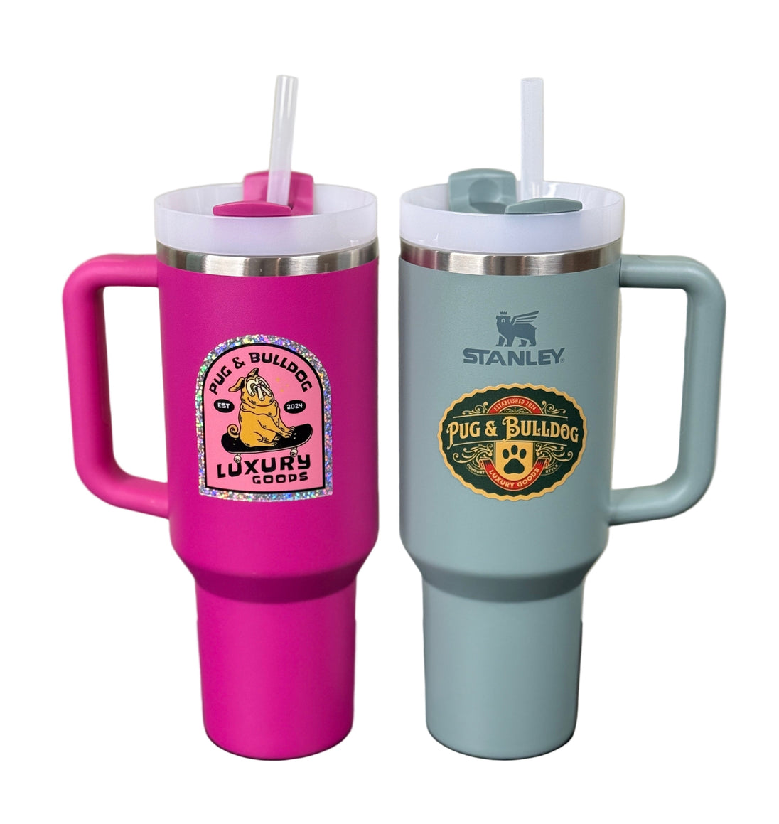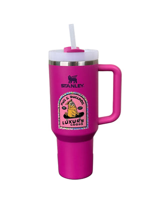 This is our own P & B Stanley 40oz Quencher H2.0 Tumbler. Insulated Stainless Steel in Fuchsia with straw and Flowstate 3 position lid. This is a genuine Stanley product emblazoned with our own sparkly logo. Whether headed to work or the beach this is a must have to stay hydrated throughout your day. 12" high by 4" wide.