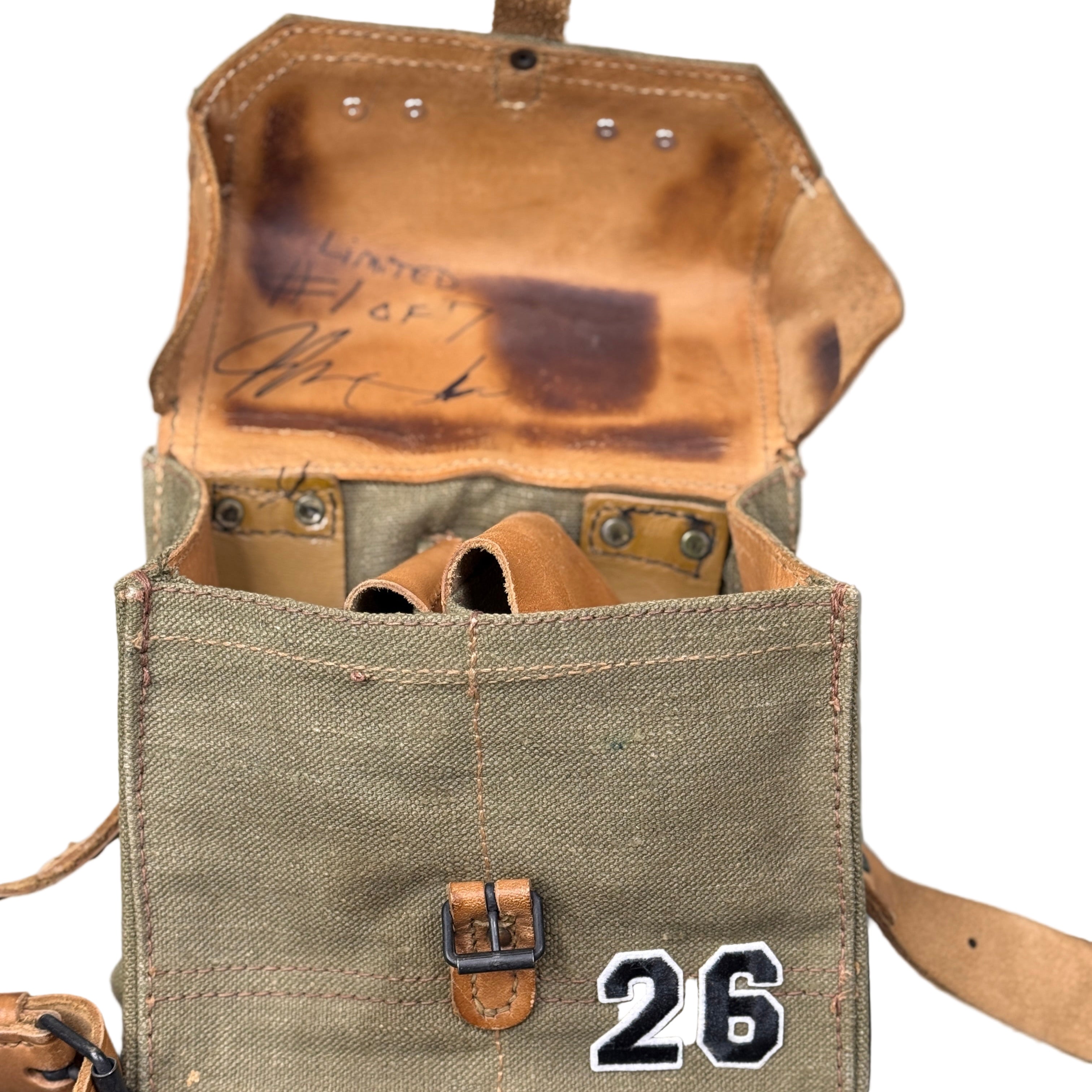 This is our 3rd Year 2026 Limited Edition Vintage Military Surplus shoulder Pouch. Limited to only Seven pieces. These 1970's era super heavyweight canvas and leather military surplus shoulder bags have lasted over 50 years and are now ready to start a new life. No matter what your weekend plans you will love this bag for every situation. Perfect for wallet, Phone & necessities when out and about. We carefully added the Pug & Bulldog touch to these. Small in size and capacity with two internal sections. These were originally ammo pouches and have a super thick leather shoulder strap. These pouches were used so some color variations to bag and Leather components should be expected but that's what makes them so amazing! The dimensions are 8" high by 9" wide by 4" deep.
