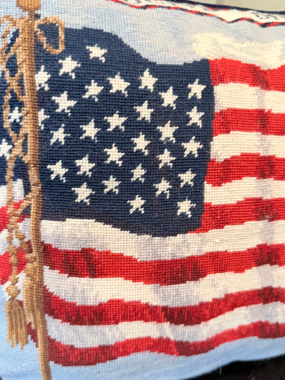 Our “Count on America” handmade needlepoint throw pillow is a celebration of traditional craftsmanship. Meticulously stitched in rich wool needlepoint on a sturdy cotton canvas ground, it reflects time-honored techniques and enduring quality. A concealed zippered back allows for easy insert placement while preserving its refined silhouette.