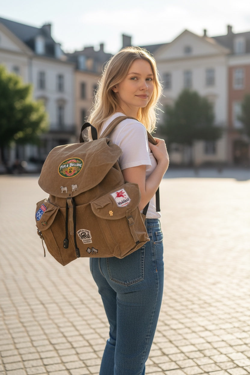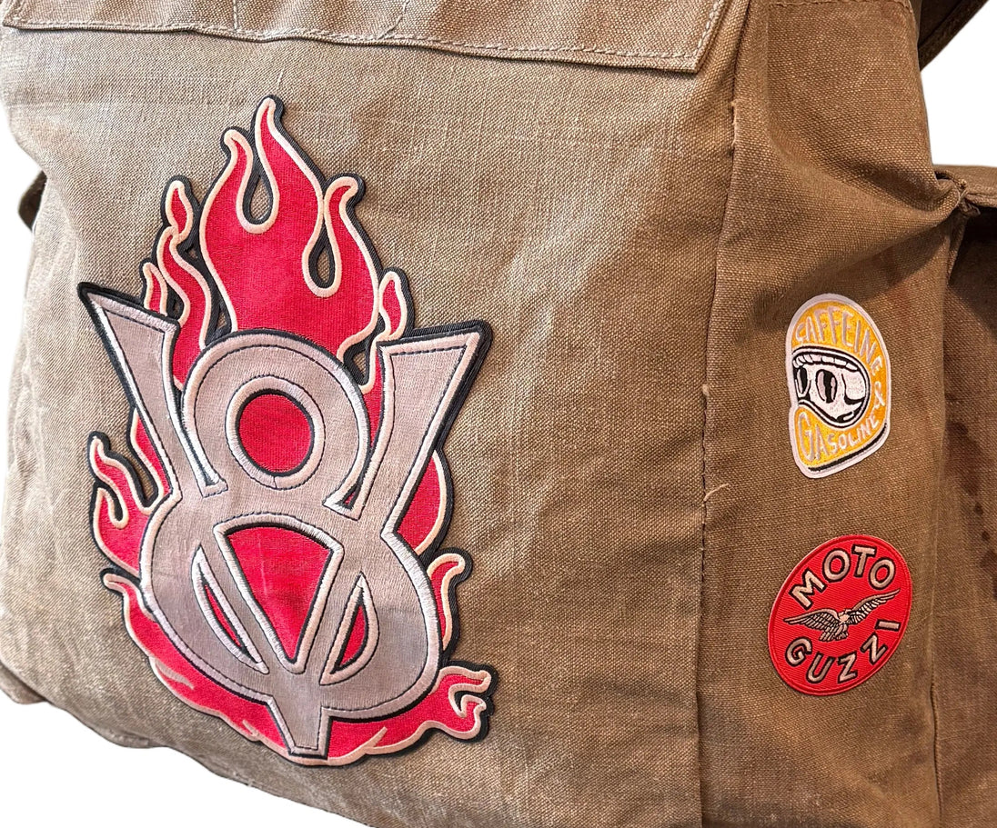 Our Vintage Upscaled 1960's Military Rucksack is a masterful blend of heritage and artisan craftsmanship. Each piece begins as a genuine military issued rucksack, meticulously and thoughtfully enhanced in the signature Pug & Bulldog style. Hand-applied motorsports embroidered patches and a vintage (2001) original 9-11 pin (side front pocket flap) showing the twin towers with a U.S. Flag, transform it into a one-of-a-kind statement of timeless style. We were only able to obtain eleven of these and when they are gone that's it!