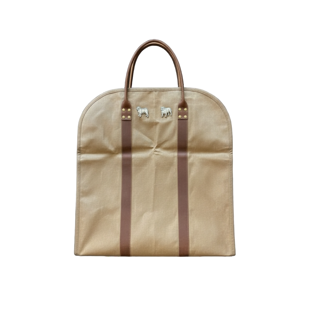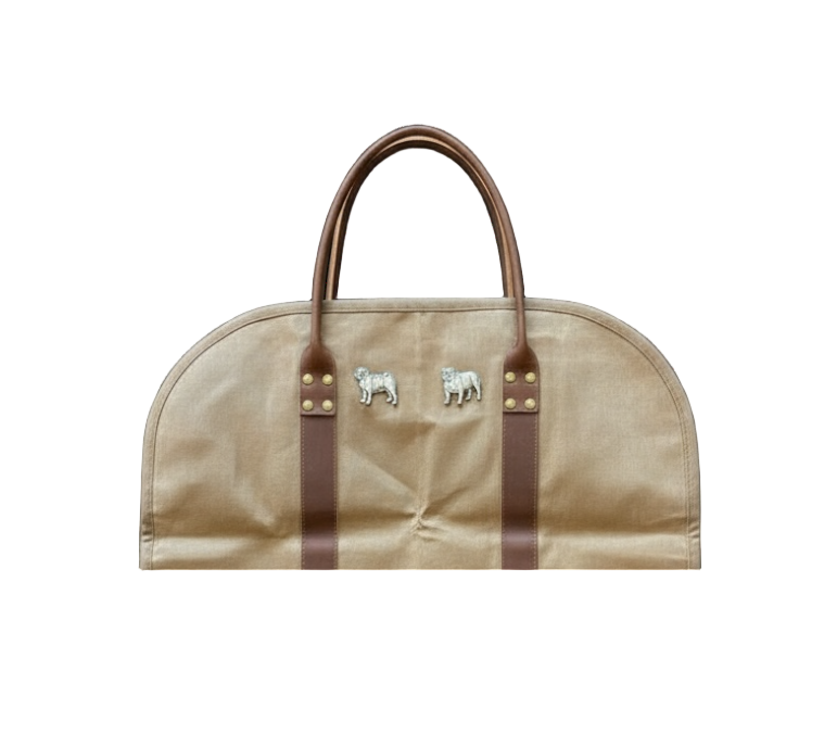 This is a tough but chic waxed Canvas and Leather Log carrier that is the perfect tool to keep your crackling fireplace stoked. Ample size to carry a good amount of firewood. Heavy duty waxed canvas with Crazy Horse Leather Handles & straps with Brass rivets to provide generations of reliable service. Named after our rescued big & sturdy brindle English Bulldog. Dimensions: 38" long (open) by 18" wide, not including handles.