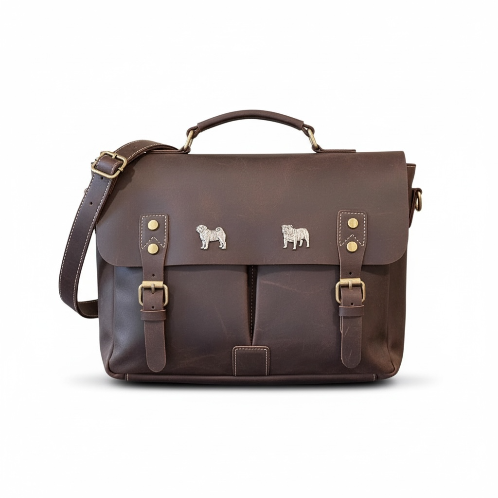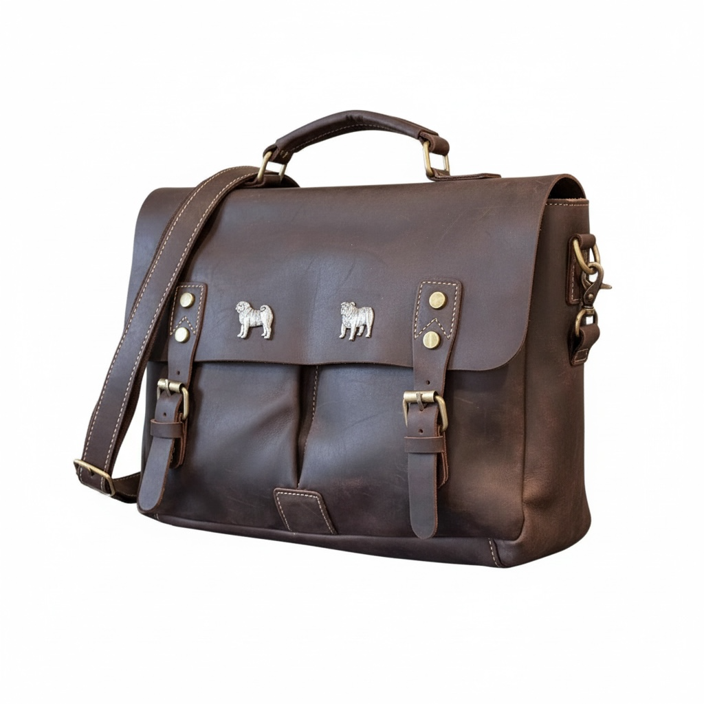 The Hector briefcase is the ideal size for the person on the go. Ready to head to the office or across town to your next meeting. Made to handle your Laptop, iPad, phone and files for your day. Two 1/2 size Leather pocket under the main flap and a quick access and a full size back pocket with two snap closures. Plenty of Interior pockets in the main compartment for all your small items. Interior has a padded Laptop pocket that will accommodate up to a 13" laptop. Zipper closure at the top to keep anything from sliding out and a fold over flap for added security. Heavy duty construction of Crazy Horse Leather with brass zippers & hardware. Extra long adjustable Leather and canvas shoulder strap. Named after our big goofy Chocolate Labrador. Dimensions: 16" wide by 11" high by 5" deep, not including shoulder strap.
