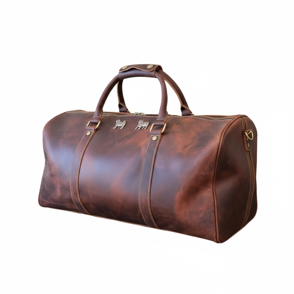 This Stunning Large Leather duffle bag is ready to head to the gym or off to a weekend in Monaco. Large capacity to easily handle a long weekend away. Includes a zippered shoe bag on one end. Interior has side pockets for all your small items. Heavy duty construction of Crazy Horse Leather with brass zippers, hardware and feet to protect the bottom. Leather shoulder strap and luggage tag included. Named after our rescued Bulldog. Dimensions: 20" long by 11" high by 10" deep, not including straps.