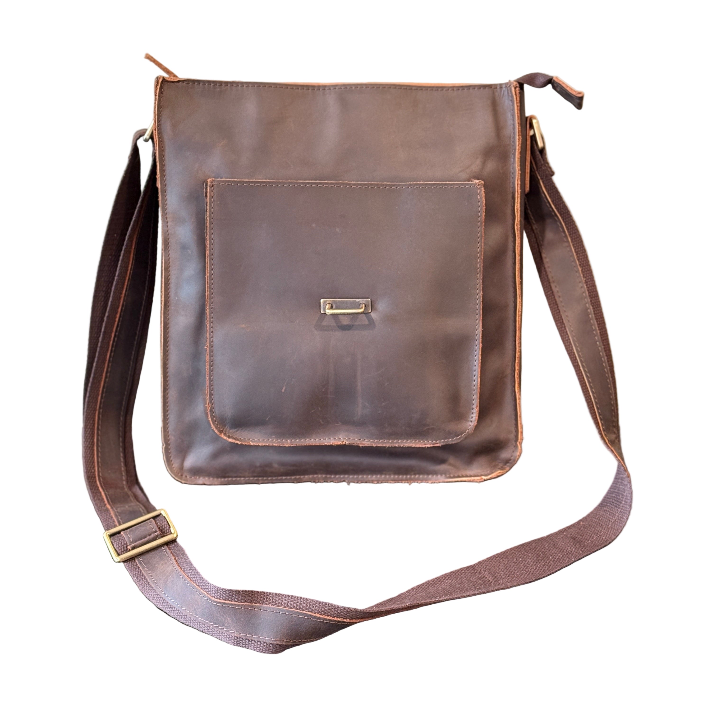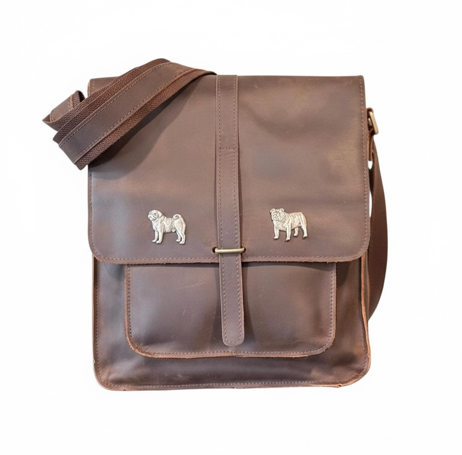This perfect size Leather messenger bag is ready to head to the office or your next meeting. Medium size to handle your iPad, phone, keys and other necessities for your day. One 3/4 size Leather pocket under the main flap and a quick access back pocket with snap closure. Plenty of Interior pockets in the main compartment for all your small items. Zippered closure at the top to keep anything from sliding out and a fold over flap with a single strap closure for added security. Heavy duty construction of Crazy Horse Leather with brass zippers & hardware. Extra long adjustable Leather and canvas shoulder strap. Named after our extremely intelligent Puggle. Dimensions: 10" wide by 12" high by 4" deep, not including strap.