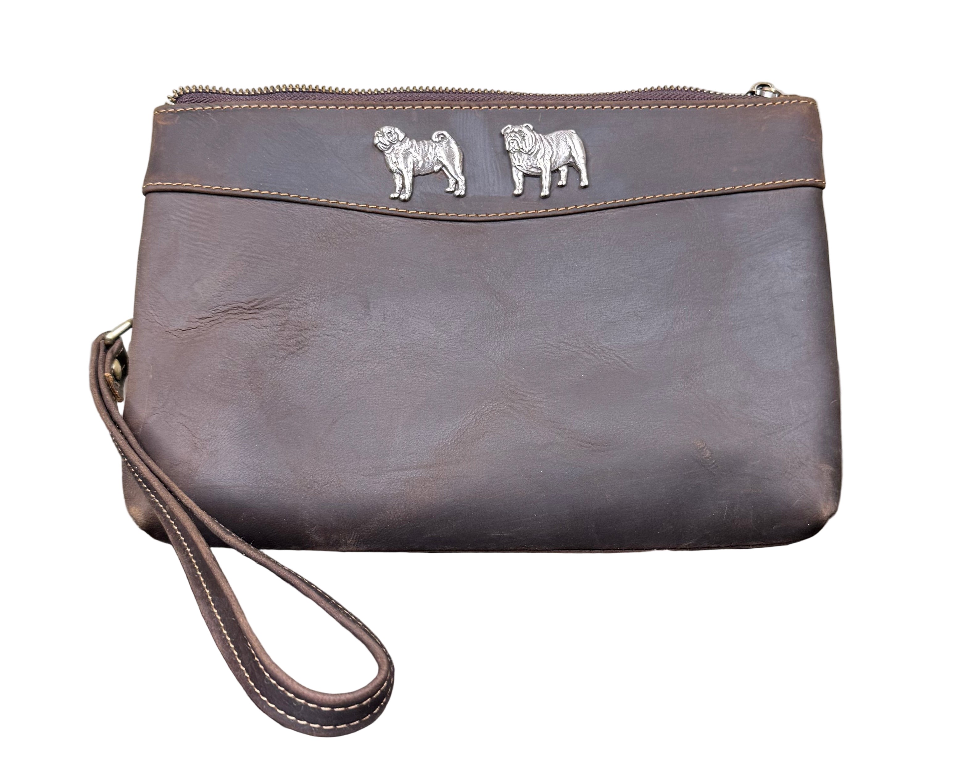 This is the ideal daily Leather wristlet that is ready to head to the office or your next meeting. Medium size to handle your Phone, Wallet, keys and other necessities for your day. Plenty of Interior pockets in the main compartment including one zippered. Zippered closure at the top to keep anything from sliding out. Includes a detachable wrist strap on the back. Heavy duty construction of Crazy Horse Leather with brass zippers & hardware. Named after our very cute but odd Black Pug. Dimensions: 10 1/2" wide by 7" high by 1" deep.