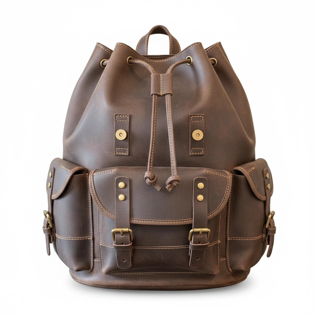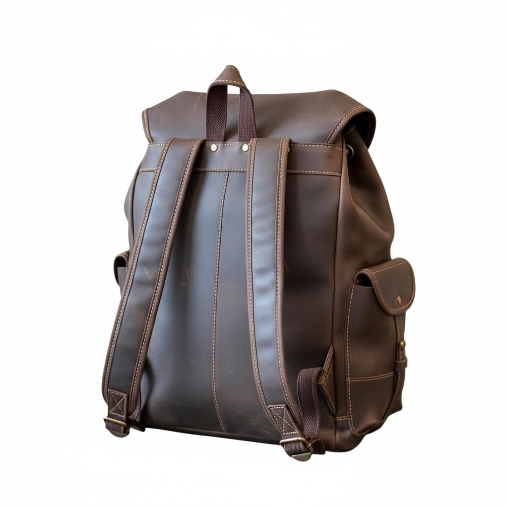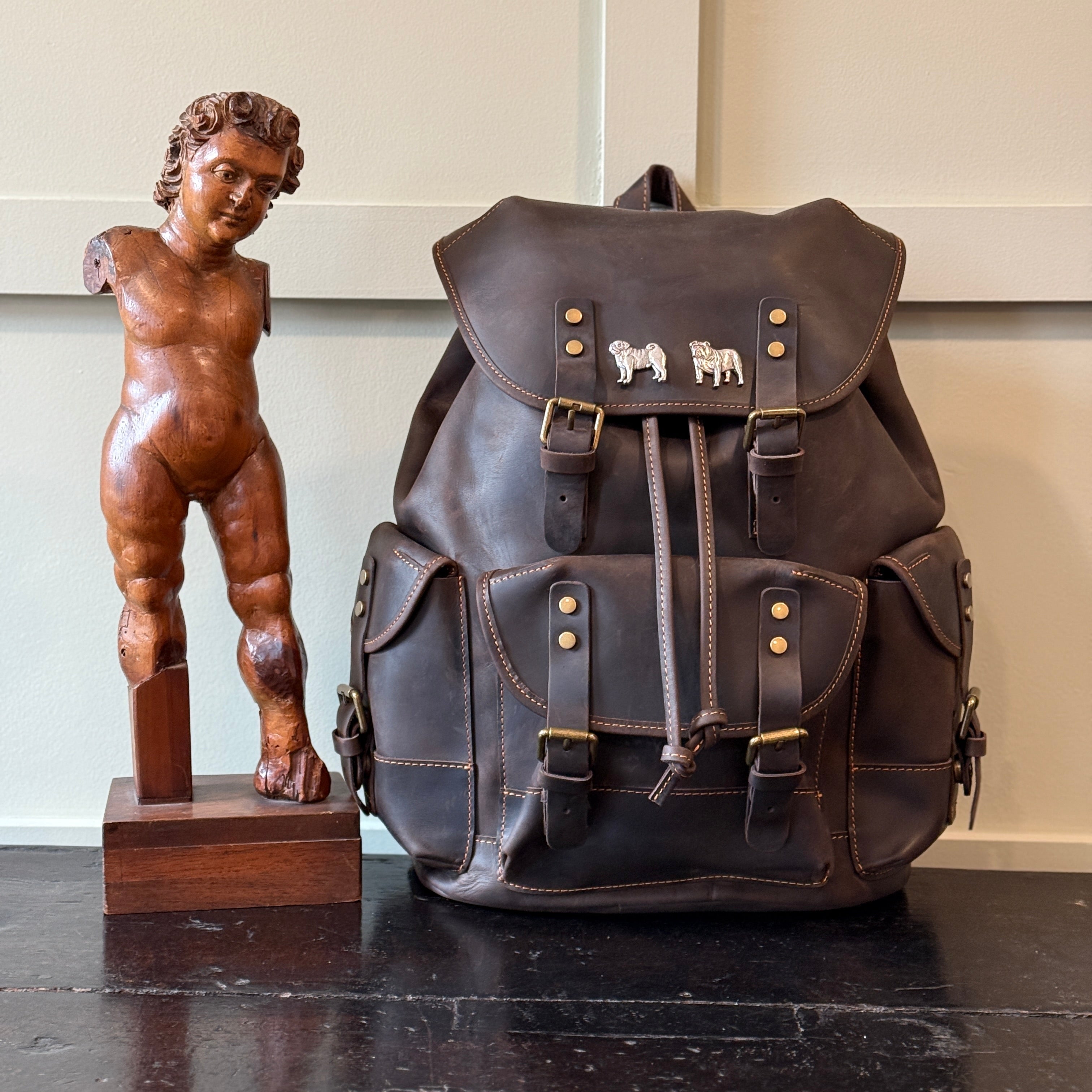 This Gorgeous Large Leather Backpack is the answer for day touring in your favorite city or a weekend in Nantucket. Large size to accommodate everything you would need for your day out, while leaving plenty room for souvenirs. Exterior has three generous sized quick access pockets. Interior has a padded iPad or Laptop pocket that will accommodate up to 10" by 12" dimensions. Multiple other pockets including one zippered for all your small items. Heavy duty construction of Crazy Horse Leather with brass hardware and rivets. Padded Leather shoulder straps and a Leather grab handle at the top. Named after our founders beloved English Bulldog. Dimensions: 17" wide by 18" high by 8" deep, not including straps.